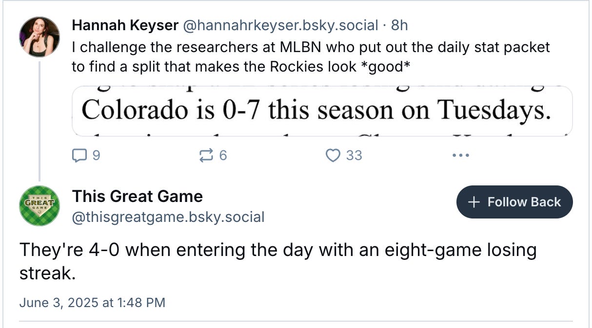 ⚾ The Rockies secured their first series win since last September by taking the first two games against the Marlins this week. But not before MLB Network’s research packet made an almost unnecessarily rude observation about a particular split. I noted this on Bluesky and was treated to a delightful series of replies attempting to find a split that is flattering to the now 11-50 Colorado Rockies. I’m including my favorite, but you can click through to see others. –HK