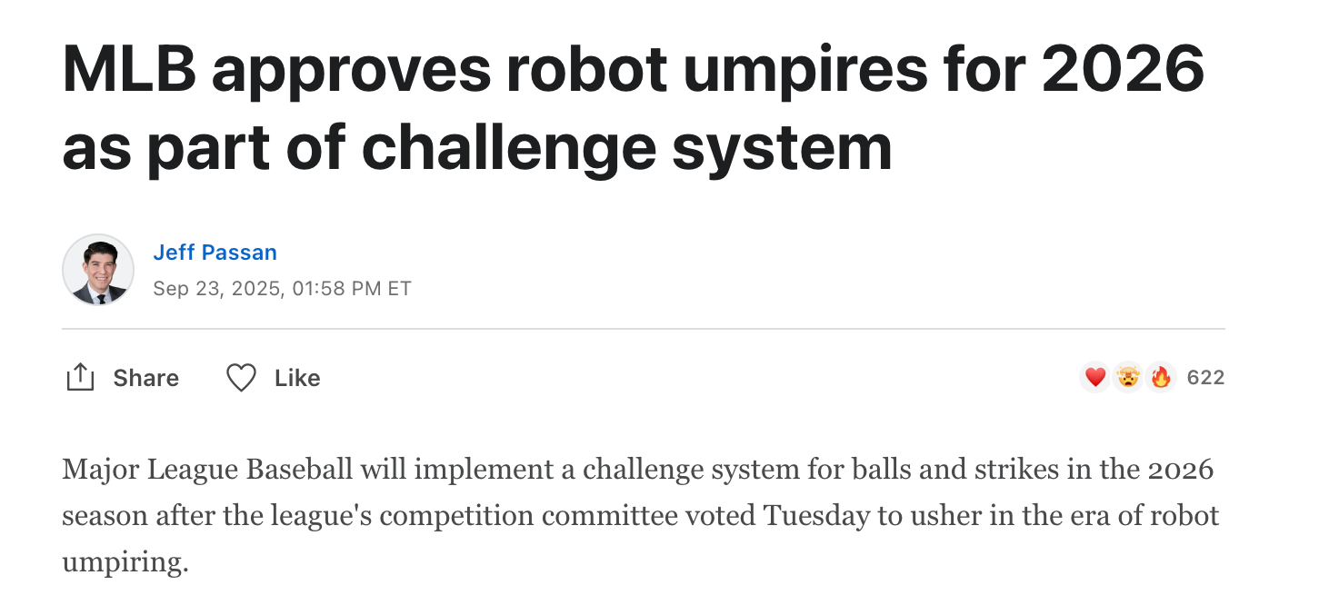 This comes after years of testing both the challenge system and full ABS in the minors and in Spring Training. Which means I — and every other baseball writer — has had ample opportunity to analyze the system and talk to stakeholders. For instance, I’ve written about how the challenge system and full ABS each impact the role of catchers (which convinced me to vastly favor the challenge system), what big leaguers thought of the test run this past spring, and even why people were still pursuing umpiring when it seemed computers were coming for their jobs.