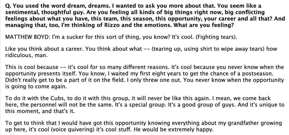 ⚾When I saw clips of Matthew Boyd, whose grandfather was a Cubs fan, discussing the great honor of pitching Game 1 for the Cubs at Wrigley Field, well I knew I had opportunity on my hands — to find out how the esteemed professional transcribers who are on-hand for every playoff game press conference would dispassionately note audible displays of passion.