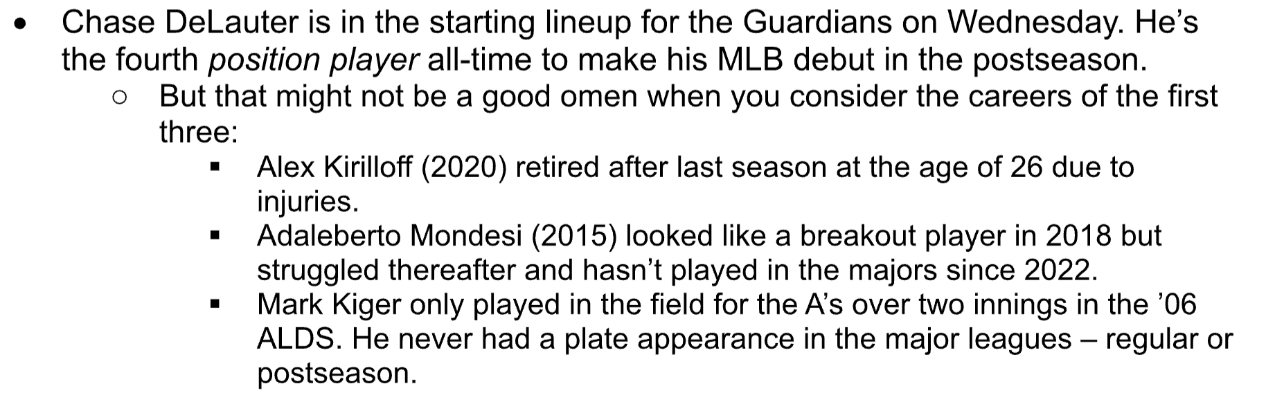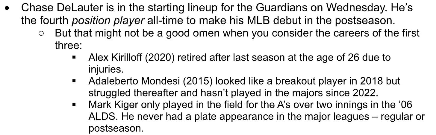 ⚾Postseason Major-League Debut Alert: Twenty-three-year-old Chase DeLauter, one of the Guardians’ top prospects, made his big-league debut playing center field. Not only had he never played in the majors before this do-or-die postseason game, he hadn’t so much as taken a competitive at-bat in any level since July 11 because of a hamate injury, and he hadn’t played center since 2024 at Double-A.