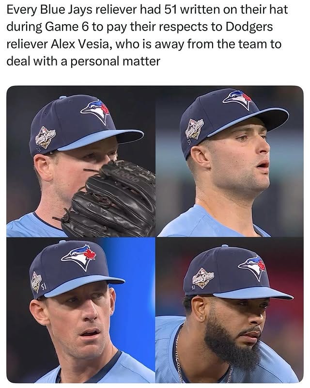 ⚾ Because of how Game 7 played out — so exhilarating! Suboptimal for getting a jumpstart on writing! — I was 600+ words into my “Jays win” story before I ultimately had to scrap that version. If I had finished it, I would have ended up repeating a lot of what we talked about in our live stream earlier in the World Series. Namely, that, in the past half decade, the Blue Jays have shown a rare degree of optimism, believing their talented core was not fundamentally flawed despite repeatedly being bounced in the first round of the postseason, and even persisting when they fell all the way to the AL East basement.